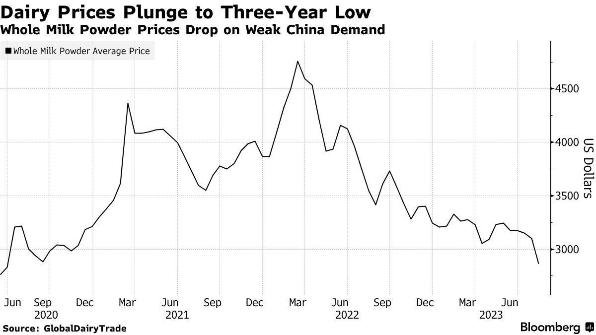 由新西兰乳业巨头恒天然主导的全球乳制品拍卖价格被看做是全球乳制品价格走势的风向标。需求疲软以及产量提高使得全脂奶粉的平均价格较2022年3月创纪录的每吨4757美元下跌了近40%。西太平洋银行新西兰(Westpac New Zealand)高级经济学家Nathan Penny上周曾表示,全球乳制品价格的下行趋势持续的时间比预期的要长得多。
